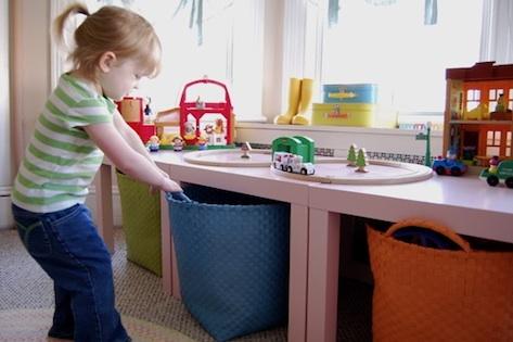 Each toy should have its own designated place in your child’s room. Spend some time showing him where each item belongs. Have him repeat back to you each toy’s place so you can be sure he or she understands. Let him know that each toy needs to be in its established spot at the end of each day.